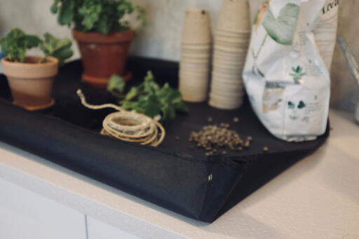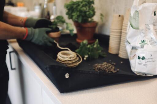 Istutusmatto, joka tekee työstä helppoa ja pitää paikat puhtaina. Istutusmaton ansiosta tiskipöytä, parveke tai terassi pysyy istutushommissa puhtaana. Aseta matto alustan päälle ja käytä painonappeja nostaaksesi maton reunat ylös niin, että multa ja kasvin osat pysyvät paikoillaan. Vettä hylkivä tekstiilipinta on helppo puhdistaa, ja maton voi taitella helposti säilöön.