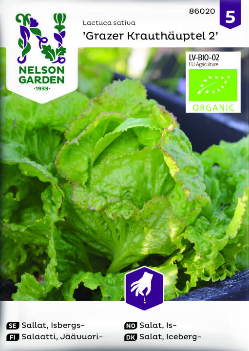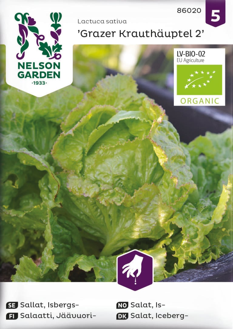 Luomulaatuinen siemen. Hieno salaattilajike, tuottaa isoja tiiviitä keriä, lehdet punertavareunaisia. Korjaa kokonaisia taimia vähitellen. Toista kylvö joka 2. viikko, saat satoa koko kesän. Ei kuki herkästi.