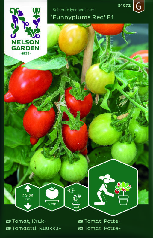 'Funnyplums Red' F1 on kaunis, pieni ruukkutomaatti, jota voi viljellä halkaisijaltaan 12-16 cm suuruisessa ruukussa. Omanlaisensa lajike, sillä tomaatit muistuttavat muodoltaan luumua ja niissä on terävähkö kärki. Vaikka taimi on pieni, se antaa suuren sadon helposti poimittavia tomaatteja. Niiden maku on täyteläinen, ja maussa on ihanaa makeutta.
