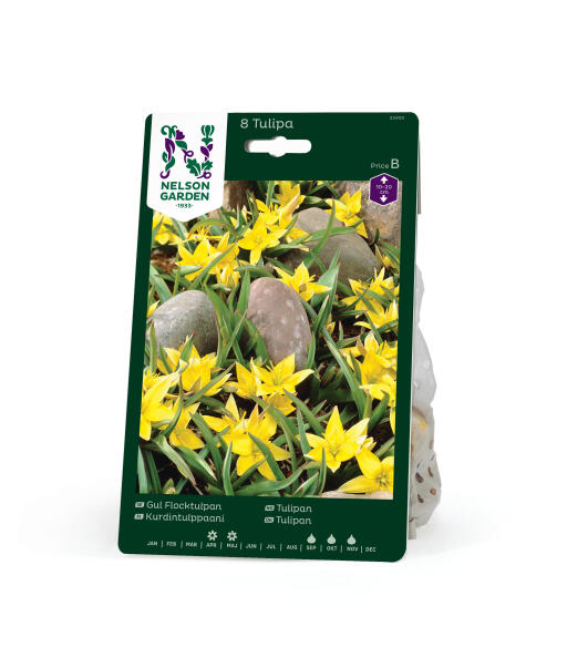 Täydellinen, pitkä tulppaani varhain kukkivaan kevätpenkkiin ja kivikkopuutarhaan. Tähdenmuotoiset kirkkaan keltaiset kukat levittäytyvät tummanharmaiden lehtien ylle - samassa varressa on usein kaksikin kukkaa! Kukinnan jälkeen kehittyvät koristeelliset siemenaiheet.
