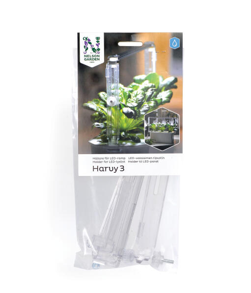 Harvy-laatikolle (Harvy 3, tuote 5541) tarkoitetun kasvivalaisimen ripustin. Kiinnitetään laatikkoon, jolloin laatikon voi sijoittaa mihin tahansa. Korkeutta on helppo säätää (18–35 cm). Valaisin LED Small (tuote 5564, 39 cm) kiinnitetään klipseillä ripustimen yläosaan. Läpinäkyvää PC/PMMA:ta.