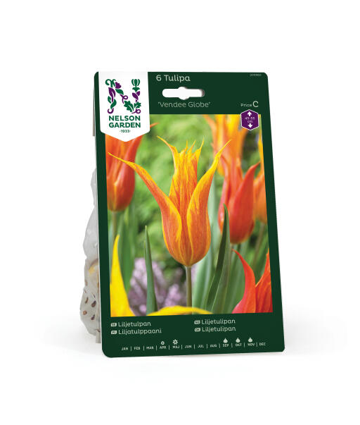 Tämä tyylikäs tulppaani loistaa kukkapenkissä kuin palava soihtu. Jokaisessa kukassa on ainutlaatuinen kuvio oranssinpunaisia liekkejä keltaista, suippoa terälehteä vasten. Istuta suuriin ryhmiin luodaksesi näyttävän vaikutelman. Sopii leikkokukaksi.