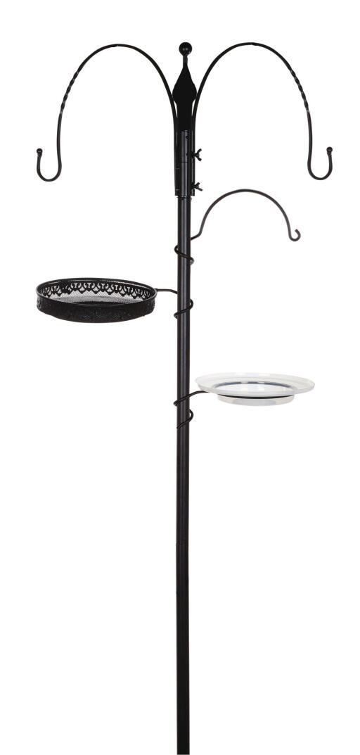 Käytännöllinen teline linnunruoka-automaateille. 3 koukkua (2 kiinteää), kylpypaikka ja ruokapaikka, jossa verkkopohja. Musta metallitanko on säädettävä (4 osaa). Tukijalat pitävät telineen vakaana. 50x247cm (kaikki osat käytössä).