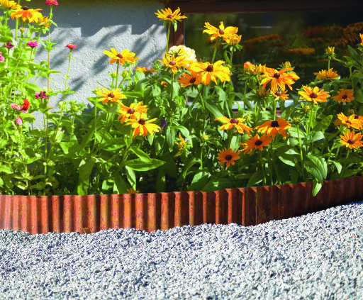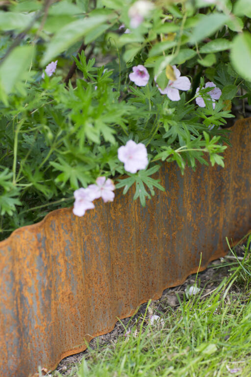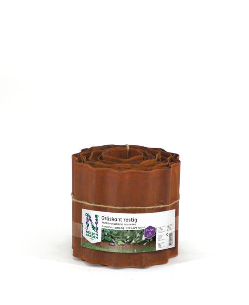 Metallinen nurmireunus puiden, kukkapenkkien tai muiden istutusten rajaamiseen. Ruosteenmetallinen sävy tekee nurmireunuksesta sekä käytännöllisen että koristeellisen. Käsitelty värjäämisen estämiseksi.