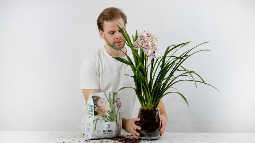 2. Poista vanha multa ja kuolleet juuret ja varret. Leikkaa varsista vain kellastuneet osat, sillä myös vanhoihin varsiin tulee uusia kukkia. Levitä sitten juuret uuden sisäruukun pohjalle ja paina juurten väliin varovasti uutta orkideamultaa.