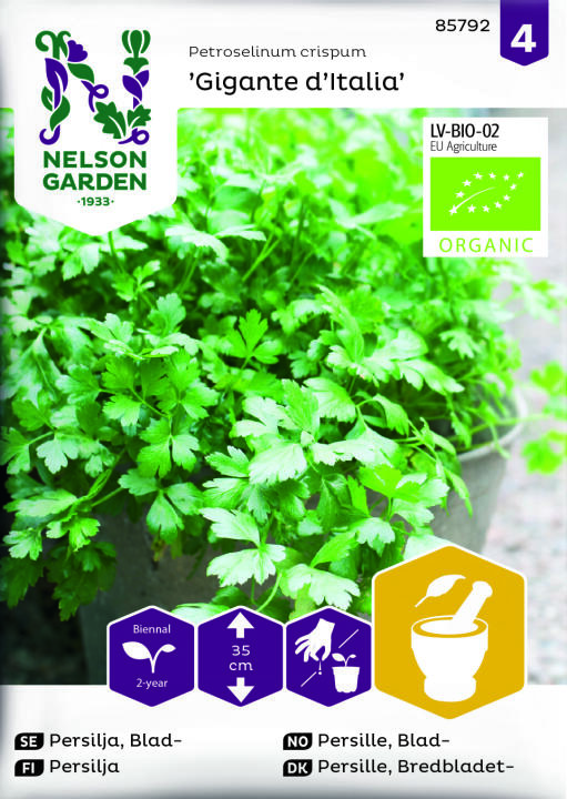Luomulaatuinen siemen. Persilja sileine lehtineen on hyvin kaunis. Kerää lehtiä tarpeen mukaan myöhään syksyyn. Taimi talvehtii, ainakin maan eteläosissa. Antaa toisena vuonna varhaisen sadon ennen kukkimista. Sopii pakastettavaksi. Viihtyy ravinteikkaassa ja hyvin ojitetussa maassa. Kastele kuivalla säällä.