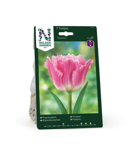 Hempeä tulppaani, jonka vaaleanpunaisten terälehtien tyvi on valkoinen ja vaaleat ripsureunat kuin pitsiä. Pari 'Dallas'-tulppaania vaaleanpunaisessa kimpussa on kuin piste i:n päällä. Ihana, kestävä leikkokukka.