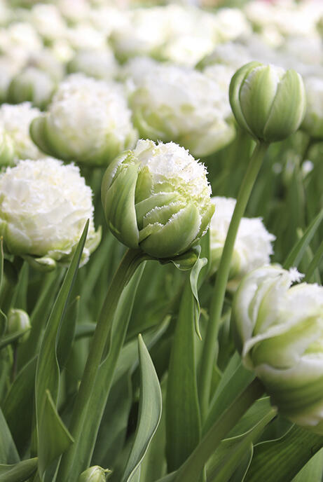 Näyttävä kerrottu ripsureunainen tulppaani vitivalkoisessa värissä. Tiiviit kukat vievät ajatukset kimalteleviin lumipalloihin ja välkkyviin kristalleihin. Upea sekä kukkapenkissä että kimpuissa.