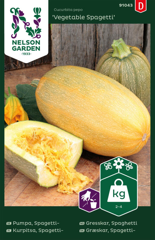 Hieman erilainen ja jännittävä keltahedelmäinen kurpitsa. Sen hedelmäliha muuttuu kypsennettäessä spagettimaiseksi, syödään myös spagetin tavoin. Voidaan varastoida raakana, viileässä 1-2 kk. Esikasvatusta suositellaan.