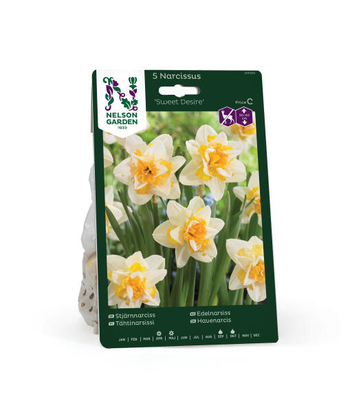 Kerrottu narsissi, jossa kermanvaaleat kehäliuskat ja kerrotussa kruunussa valkoista ja oranssinkeltaista kiehkuraa. Klassisia värejä, ylellistä tyyliä. Unelma kevään kukkapenkkiin. Lajike ei juuri maistu kauriille, jäniksille, kaneille ja myyrille.