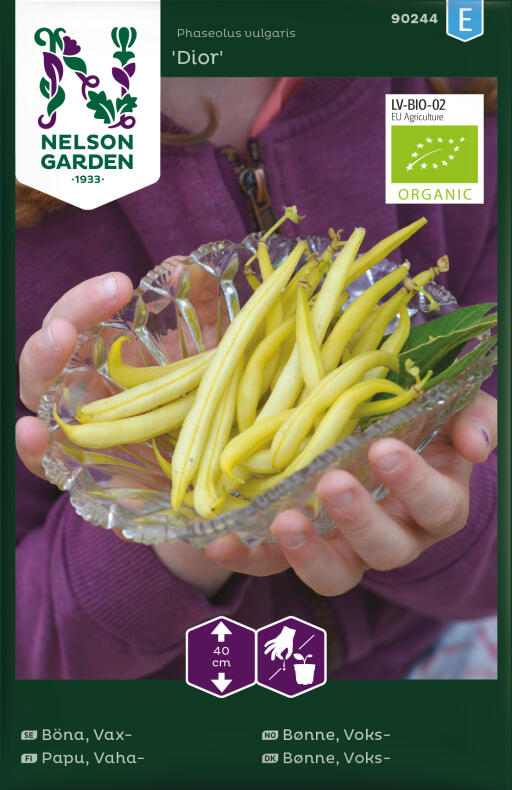 Luomulaatuinen siemen. Maukas vahapapu, jossa enin osa paloista lehtien yläpuolella ja helppo kerätä. Korjaa satoa vähitellen, useasti viikossa. Mainio keitettynä ja voin kanssa tarjoiltuna.